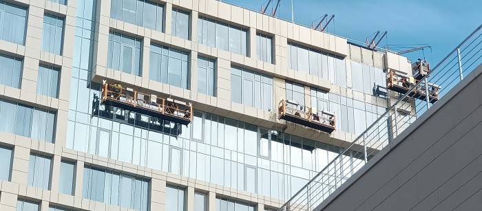 Мойка фасадов и остекления востребована для высотных зданий, торговых комплексов и бизнес-центров. Возможности подъемной спецтехники ограничены (и по высоте и по возможности подъехать вплотную) и уже справиться под силу только альпинистам. У них специальное снаряжение и необходимые инструменты и чистящие средства, чтобы добраться до самых труднодоступных мест. Они без проблем отмоют плитку фасада, стекла (оконные переплеты, подоконники, откосы, витражные окна) недоступные изнутри.